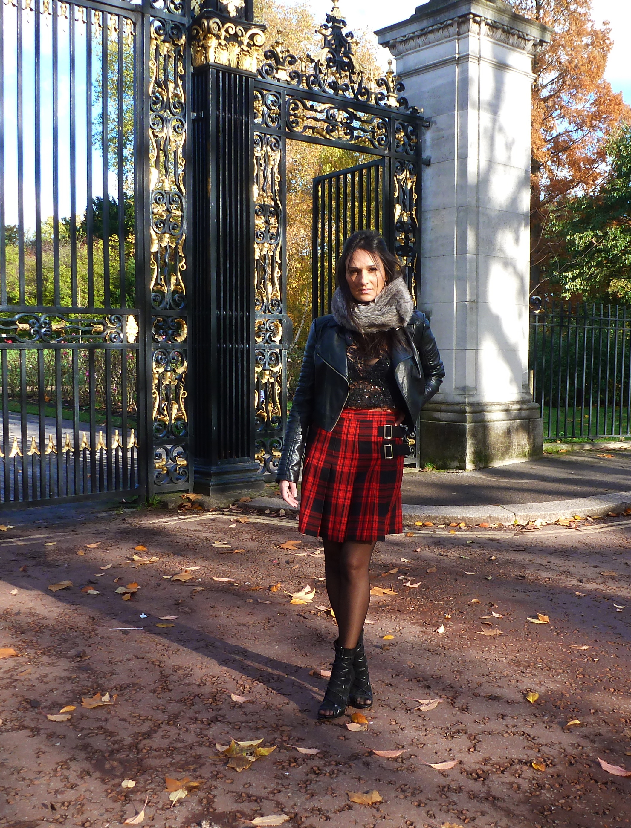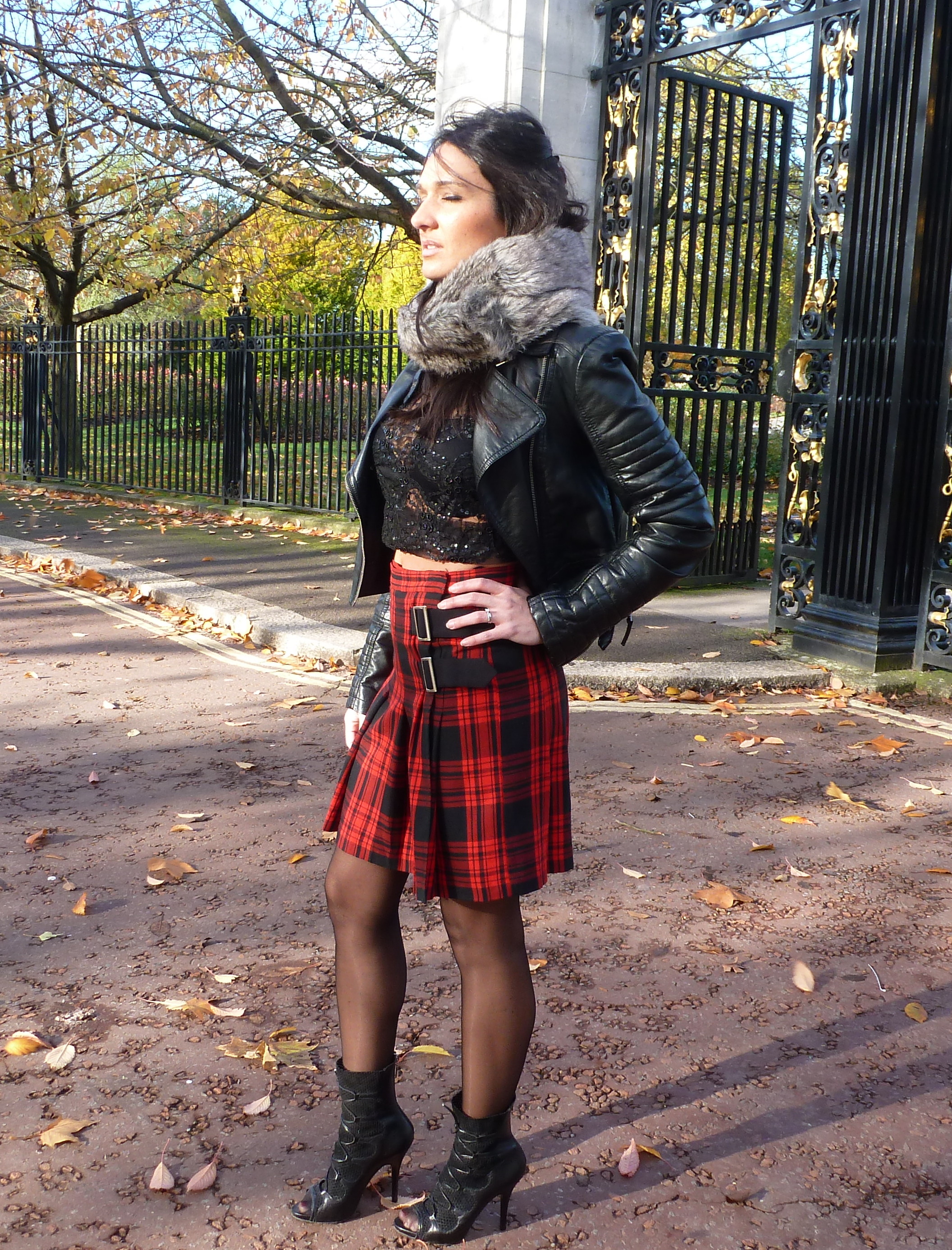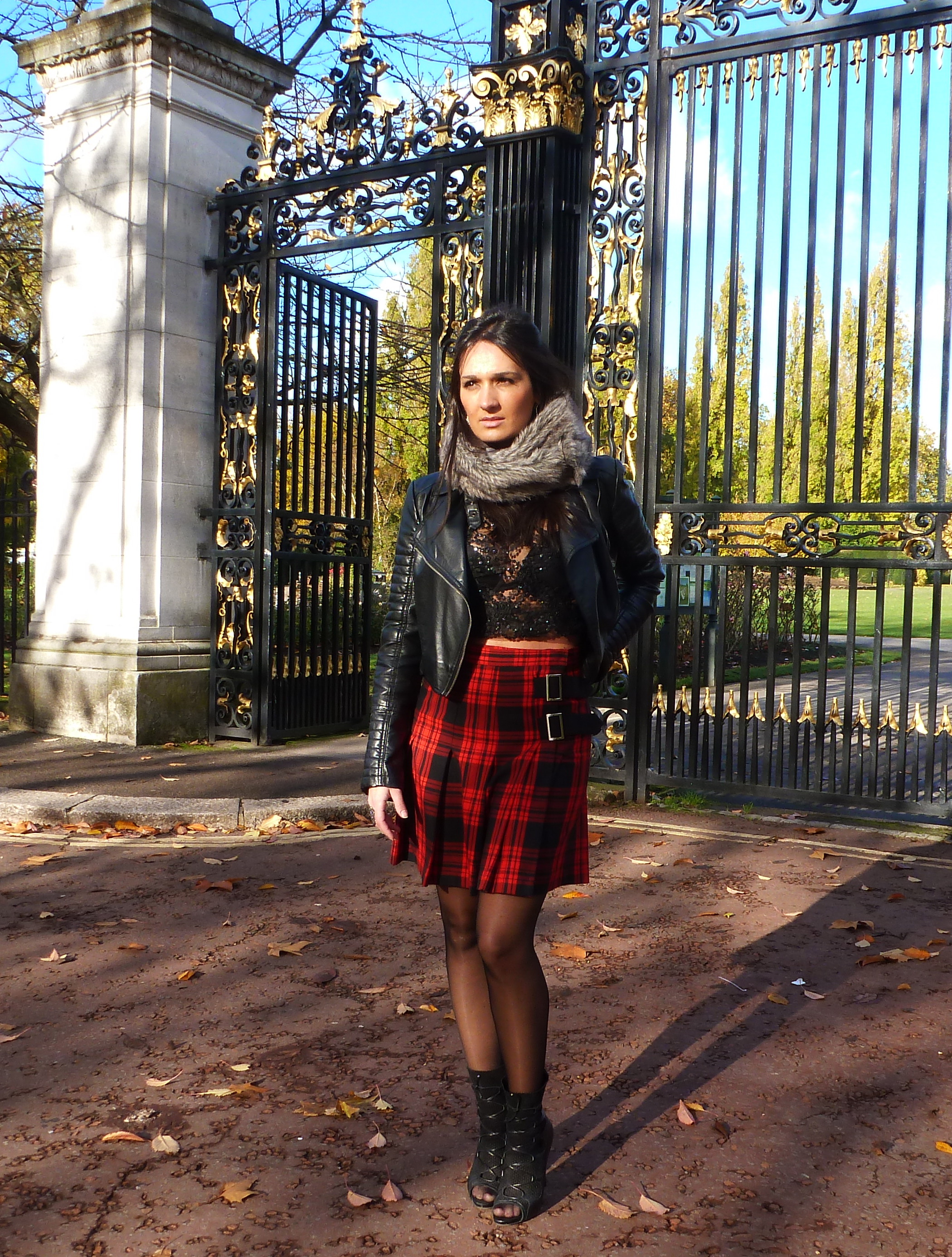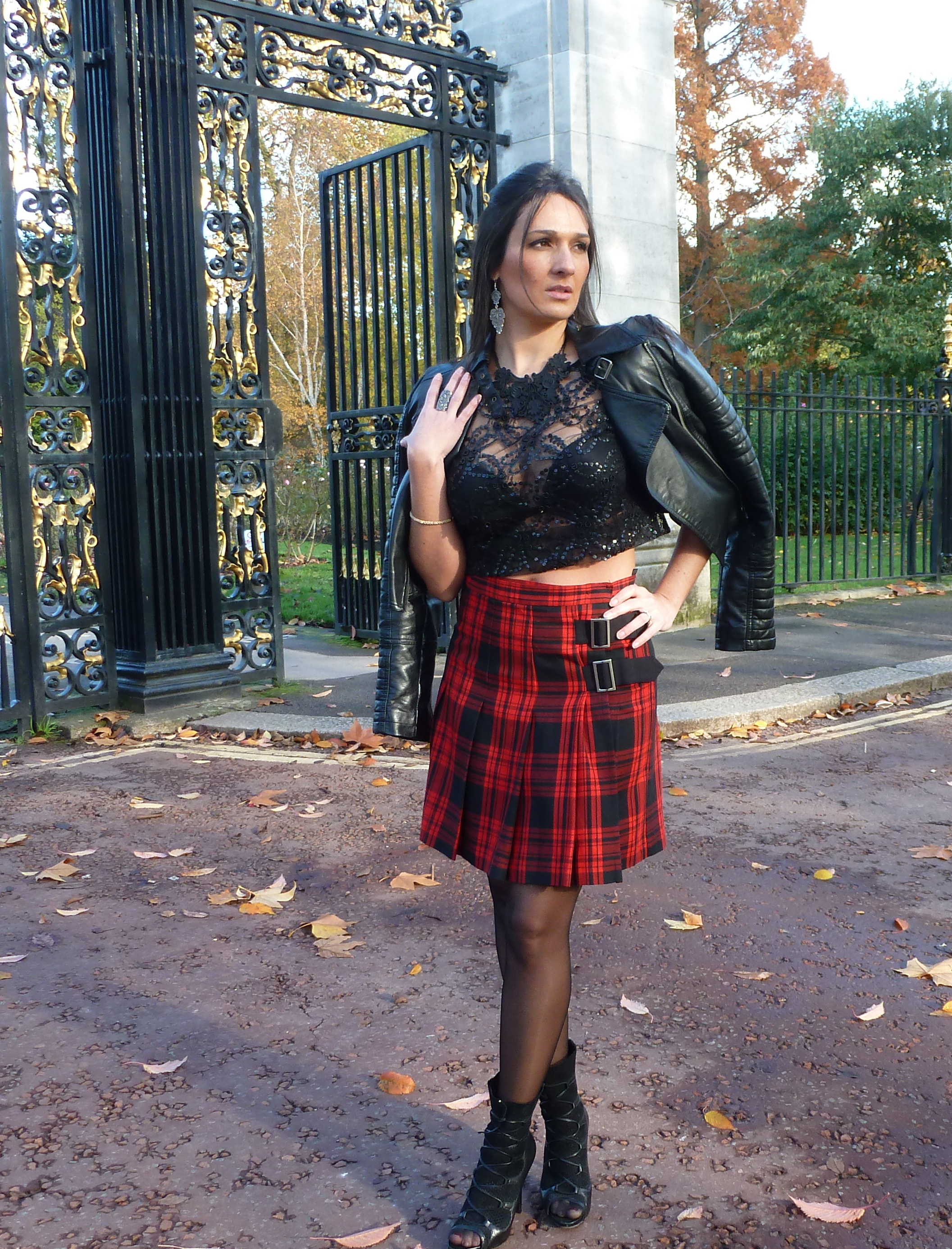 Scottish Red Tartan is in everywhere. All the shops has at least one item in this print. Top, trousers, dress, scarf, everything. I chose a pleated skirt, very Scottish. I love it. A bit Rock n’ Roll style. Match this print with black is a bit obvious and I didn’t do any different, I just chose a embellished lace top to be quite glam. Check it out: